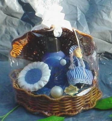 1 Luxusseife 30gr FG, 1 Flasche mit 75 ml Dusch- Cremebad, 1 Beutel mit 50 gr Perlglanz- Badesalz, 1 Duftöl- Badeperle, 1 Deko- Figur im Muschelkorb